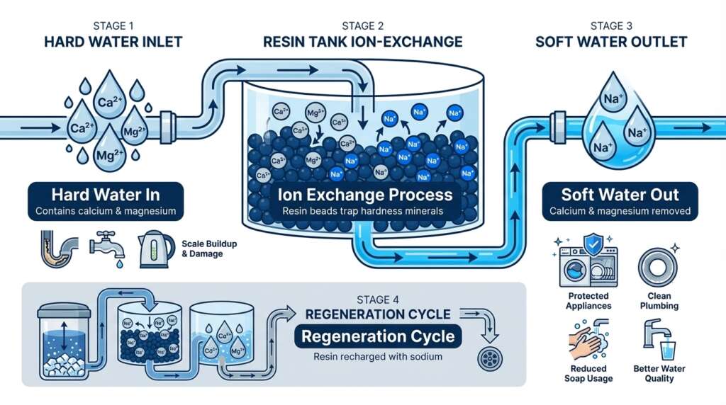 Water softeners use a process called ion-exchange to remove hardness-causing minerals from your water supply. Hard water contains high concentrations of calcium and magnesium ions, which create scale buildup in pipes, appliances, and heating elements, reducing efficiency and shortening equipment lifespan.